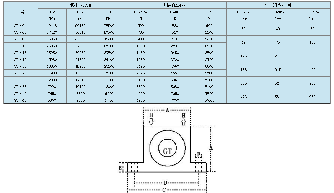 產品名稱:氣動震動器GT04GT6渦輪氣動振動器GT4GT6 產品說明: (寧波飛馳 FEICHIAN 品牌 離心旋轉式擊振器) 性能參數;